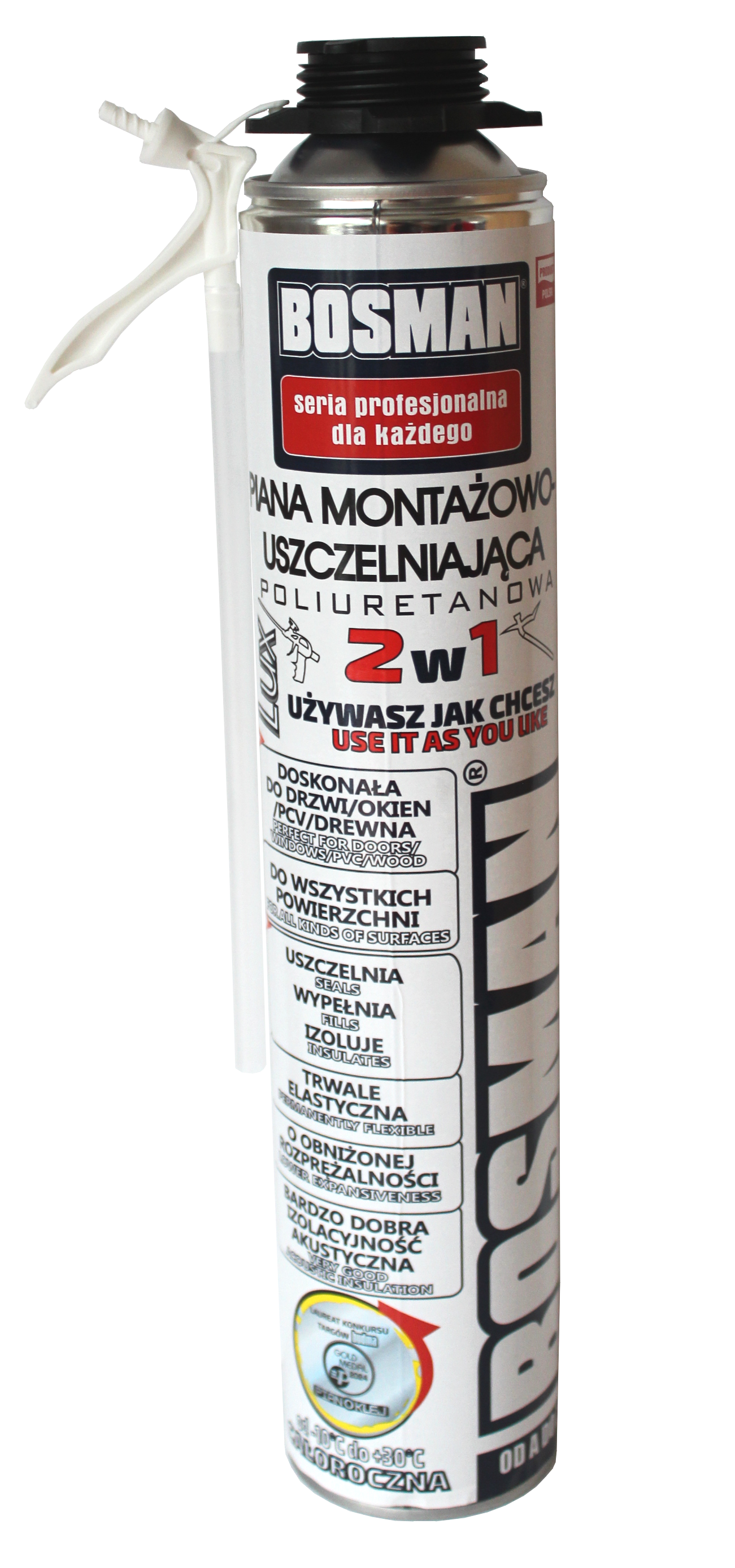 Piana Bosman Lux 2w1 jest poliuretanową pianą montażową do pracy w temperaturze otoczenia już od +5 C. Charakteryzuje się wysoką wydajnością końcową, stabilnością wymiarową w czasie, bardzo dobrą termoizolacyjnością, dźwiękochłonnością i wysoką wodoszczelnością. Doskonale przylega do metalu, drewna, PCV, betonu, tynku, szkła i tworzyw sztucznych. Jest odporna na powstawanie pleśni i grzybów. Zapewnia stabilność montowanych elementów. Piana Bosman przeznaczona jest do montażu okien i drzwi. Wykorzystywana jest również do izolowania przejść rurowych i kablowych, uszczelniania ścian, dachów, stropodachów i posadzek, wygłuszania kabin samochodowych i łodzi, wypełniania w budownictwie szkieletowym.