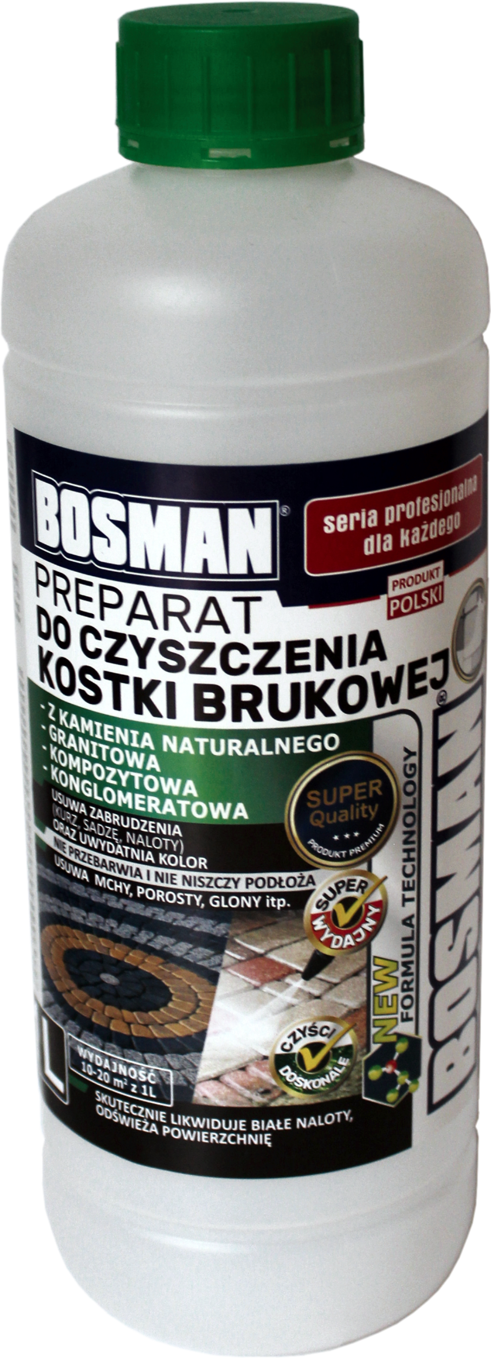 BOSMAN PREPARAT DO CZYSZCZENIA KOSTKI BRUKOWEJ to profesjonalny produkt do czyszczenia (doskonale usuwa zabrudzenia) i odtłuszczenia kostki brukowej. Preparat również świetnie przygotowuje powierzchnię do impregnacji, umożliwiając impregnatowi na skuteczniejsze działanie i przyczepność do powierzchni.